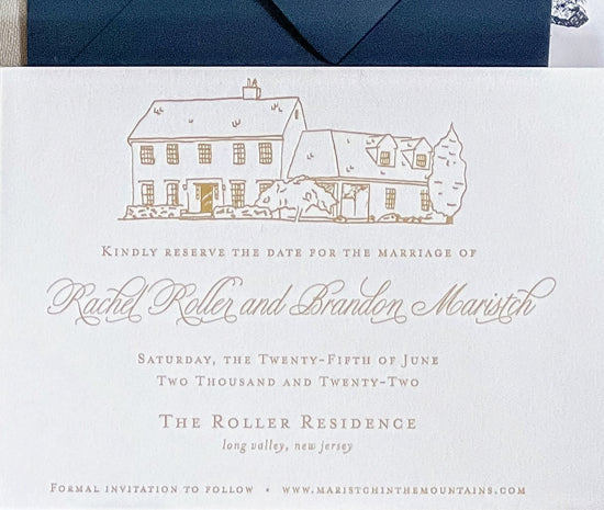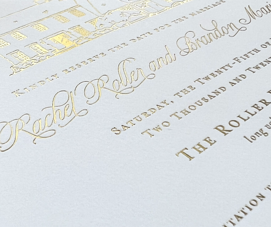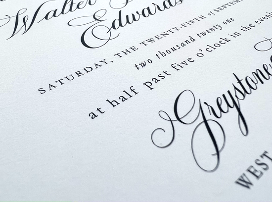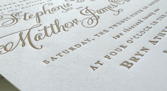 This time honored printing process is done by hand using matte ink and a metal plate, creating an impressed or debossed look on a thicker cardstock like Crane's Lettra paper. At Fox and Quill Paperie, we specialize in the best letterpress wedding invitations.
